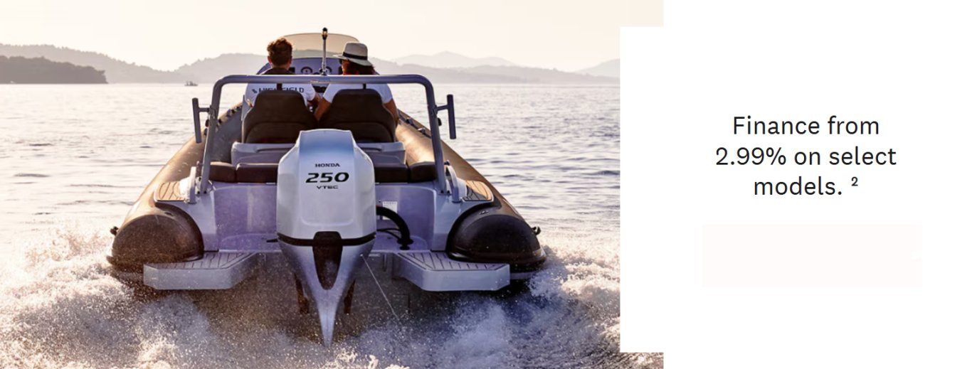 LEGAL:  *2Financing from 2.99% is available on the purchase of a new and previously unregistered Honda 15 HP, 20 HP, 25 HP, 30 HP, 40 HP, 50 HP, 60 HP, 75 HP, 90 HP, 100 HP, 115 HP, 150 HP, 200 HP, 225 HP, 250 HP or 350 HP outboard from a participating Honda Marine dealer in Canada between January 1, 2026 and March 31, 2026. See your participating Honda dealer or visit the dealer locator for details.