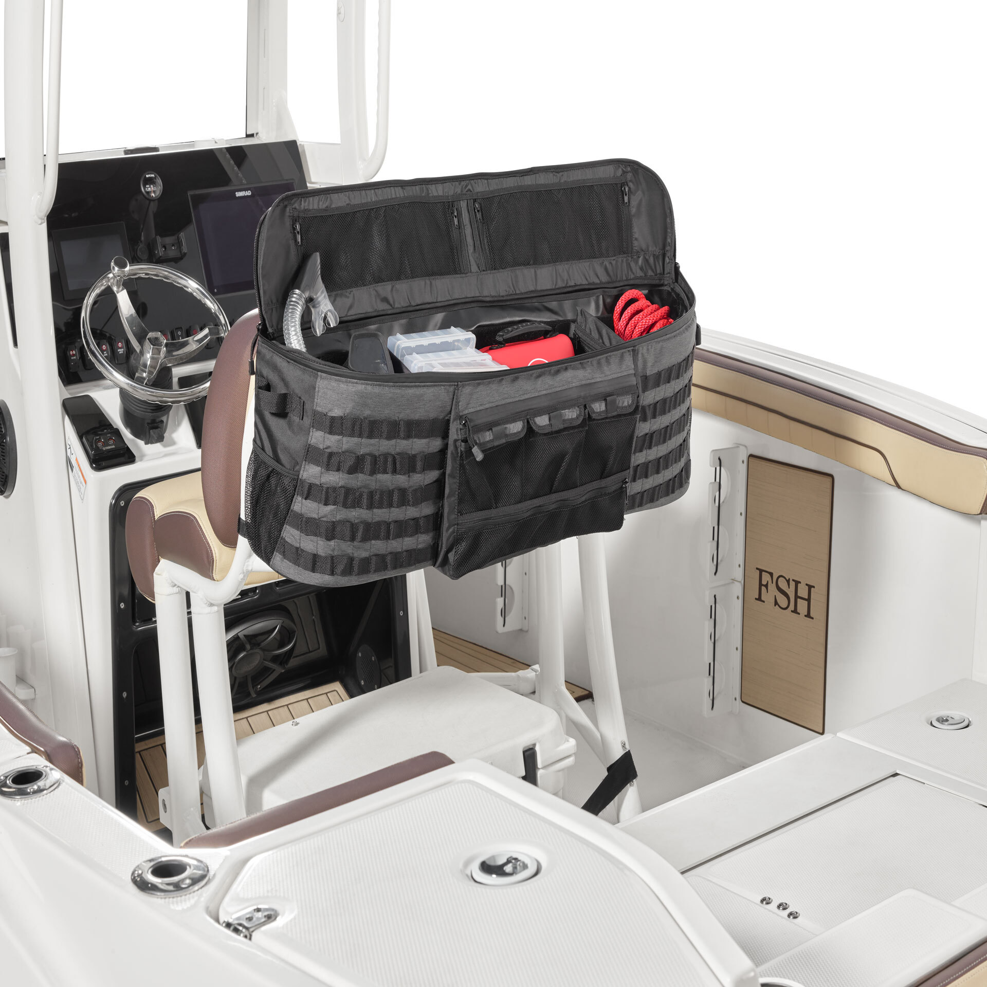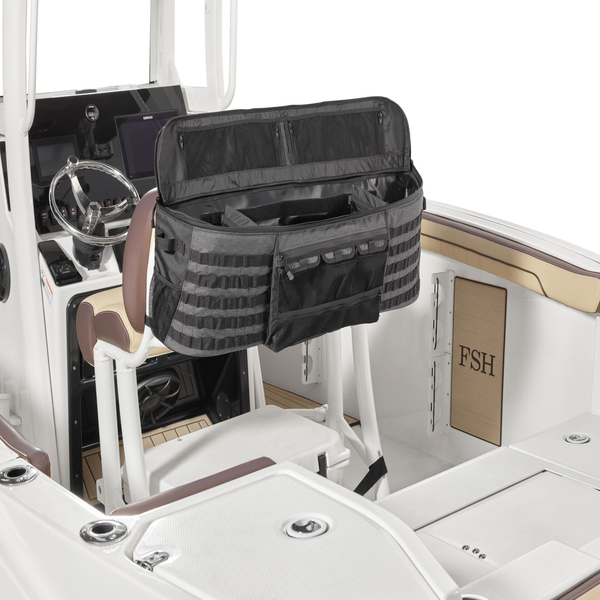 This water-resistant molded storage bag mounts to the back of the leaning post. It has exterior webbing and zippered pockets which create plenty of storage solutions for all types of gear.